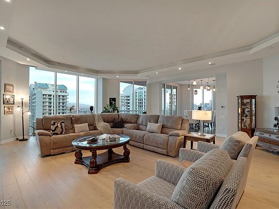 Incredible opportunity! 34th-floor Penthouse level w/ 11 Foot ceilings. 4,007 ft. , 3 Large balconies w/views of the Las Vegas Strip, Downtown & Mountains. Extra large rooms, Spacious kitchen w/new cooktop, Electronic shades throughout, 3 bedrooms + Den & 5 bathrooms. Primary Bedroom w His/Hers Baths & Closets. Large laundry Room w/Sink & Cabinets + Extra storage. 4 parking spaces & You have the option to valet a 5th car. The HOA fees covers water, gas, cable, internet, valet, concierge, limo services, security, on-site management. Additionally, The Stirling Club, a private club located on the grounds offer full spa services, including a salon, barber shop, massage, facials, nails & other treatments. The club features a large well-equipped gym, Pilates/yoga classes, tennis/pickleball courts, a sauna, indoor/outdoor pools, gourmet restaurants, bar, cigar lounge, Starbucks, wine cellar & tasting room, event spaces avail for private functions. Great value Penthouse. Make your offer today!