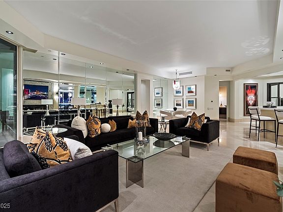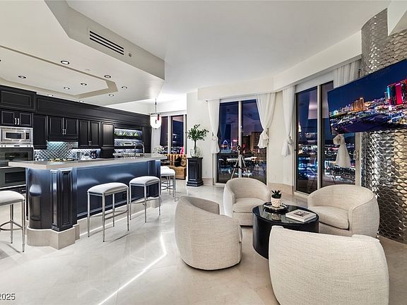 TURN-KEY! COMPLETELY RENOVATED FROM TOP TO BOTTOM! 4 BEDROOM 4.5 BATH! VERY RARE 34TH HIGH FLOOR PENTHOUSE WITH 11' CEILINGS! UNOBSTRUCTED PANORAMIC STRIP, SPHERE, DOWNTOWN, CITY AND MOUNTAIN VIEWS! ALL 4.5 BATHROOMS COMPLETELY RENOVATED WITH NEW PLUMBING AND FIXTURES, AMAZING ENTERTAINERS BAR, RENOVATED KITCHEN WITH ELONGATED KITCHEN CABINETS AND GORGEOUS STAINLESS BACKSLASH, TRANQUIL WATERFALL, CONTEMPORARY FIREPLACE WITH MARBLE AND GRANITE SURROUND, BEAUTIFUL MARBLE FLOORING, CUSTOM CLOSETS AND SO MUCH MORE! COMPLETELY FURNISHED AND READY TO MOVE IN AND ENJOY! CUSTOM PIECES SPRINKLED THROUGHOUT INCLUDING ALL ACCESSORIES, ART PIECES, BEDDING! THIS IS AN EXTREMELY SPACIOUS UNIT WITH 4 BEDROOMS SITUATED IN 3 SEPARATE WINGS FOR ADDED PRIVACY. 3 HUGE VIEW DECKS FOR ADDITIONAL ENTERTAINING AND LIVING! OPEN UNIT WITH KITCHEN, DINING, LIVING AND BAR BLENDING PERFECTLY TOGETHER FOR ENJOYMENT. THE PRIVATE STIRLING CLUB LOCATED ON THE GROUNDS WITH FITNESS CENTER, RESTAURANTS, SPA AND TENNIS!