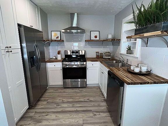 Spacious back deckStainless steel appliancesModern kitchenButcher block countertopsConvenient laundry room