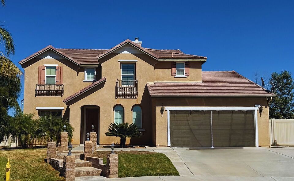 Welcome to 27480 Aromatic Court, a spacious and beautifully maintained two-story single-family home nestled in a quiet cul-de-sac of Moreno Valley. This impressive residence offers 5 bedrooms, 4.5 bathrooms, and approximately 3,667 square feet of thoughtfully designed living space. Step inside to find soaring high ceilings that fill the home with natural light and create an open, airy atmosphere. The formal living and dining areas flow seamlessly into a large family room perfect for entertaining or cozy evenings at home. The modern kitchen features generous counter space, ample cabinetry, and a convenient center island. Upstairs, a spacious loft provides the perfect space for a home office, playroom, or media area. The primary suite offers a private retreat with an ensuite bath, dual vanities, and 2 walk-in closets. Enjoy beautiful mountain views from the backyard or upstairs windows an ideal backdrop for relaxation or gatherings. Additional features include: Four-car garage, Energy-efficient windows, Low-maintenance landscaping, Convenient location near schools, parks, and shopping. This home combines comfort, style, and space perfect for families or anyone looking to enjoy elevated suburban living with scenic surroundings. Owner currently pays $30 HOA.