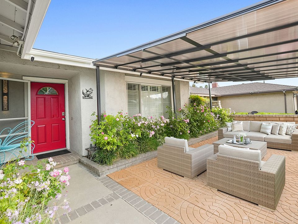 REMODELED!! 3 bedroom + DEN + 2 bathroom with PRIVATE resurfaced pebble pool and spa! Whole house water filtration, tankless water heater, EV charger, skylight, barn doors, new roof, re piped, ordered and will install new appliances including stackable washer & dryer, large front and back covered patios, plus a pool cabana, new AC, closet w/built-ins, plantation shutters, ceiling fans & movable kitchen island, wood laminate flooring * Walk thru sliding glass doors to the covered patio & grassy knoll to sit & relax & enjoy the pool & spa * The fenced, private backyard w/lush vegetation and cabana is great for enjoying the evenings under the stars. * If you stay inside there's the new central air to keep you cool * Shopping, golf, parks and Metro Link station are close by.