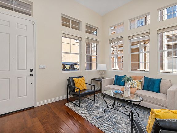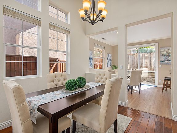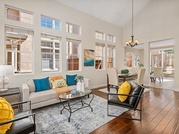 This delightful home is situated at the end of a quiet court with urban cobblestone paving in the peaceful Stoneridge Place neighborhood. The living room has beautiful hardwood floors, a stone fireplace, and a vaulted ceiling. The adjacent dining room has recessed lighting and a sliding glass door that opens to the private backyard. The kitchen is highlighted with white cabinetry, granite countertops, gas range, microwave, refrigerator, and dishwasher and a breakfast bar. The dining room and kitchen have luxury vinyl flooring, adding both durability and modern appeal. The laundry closet includes front-load washer and dryer units, with extra cabinet storage. The home has 9-foot ceilings and a half bath. Upstairs, the bedroom suite has a walk-in closet and a spacious bathroom with double sinks and a stall shower. Two additional bedrooms share a bath. The 2-car garage with finished walls includes a whole house water softener. The low-maintenance backyard is neatly landscaped with a patio, raised bed borders and a Persimmon and Apple tree. Stoneridge Place is known for its family-friendly environment and its close proximity to top-rated schools, parks, dining, shopping, BART, and I-580. Open House Sat & Sun 03/22-23 2-4p.