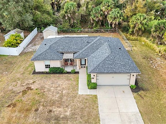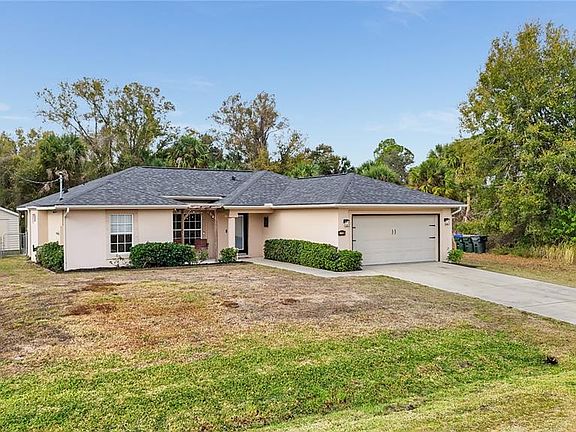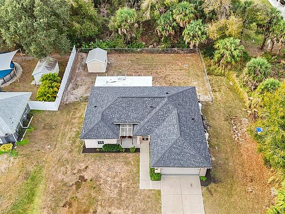 ** PLEASE TAKE A WALK THROUGH YOUR NEW HOME WITH THE 3D INTERACTIVE VIRTUAL TOUR ** Welcome to this move-in-ready 3-bedroom, 2-bathroom, 2-car garage home, tucked away on a quiet street in one of North Port’s most desirable neighborhoods. From the moment you arrive, curb appeal shines with tropical landscaping, fresh mulch, exterior lighting, and elegant entry pillars that warmly welcome you home. Relax on the charming front pergola with hanging swings, the perfect spot to enjoy a good book or soak in the Florida sunshine. Built for comfort and peace of mind, this home features a new roof (2022), A/C (2021), hurricane shutters, and a water heater installed in 2019. Step inside to a bright, open floor plan with soaring vaulted ceilings, neutral tones, and ceramic tile throughout the entire home, making it both low maintenance and pet friendly. Abundant natural light pours in through the front windows and triple sliding glass doors in the great room. A unique wood accent wall adds character and warmth to the main living space, a truly standout feature. The kitchen is well appointed with laminate countertops, subway tile backsplash, plant shelves, recessed lighting, a closet pantry, breakfast bar, and an abundance of cabinet space. Bonus, all stainless steel appliances are included. The dining area features a large window with custom sliding barn door blinds and a modern light fixture, creating an inviting space for everyday meals or entertaining. The desirable split-bedroom layout offers privacy for owners and guests alike. Guest bedrooms are generously sized with ceiling fans, ample closet space, and natural light. The guest bathroom includes a tub and shower combination, modern vanity, and upgraded lighting. The primary suite is a relaxing retreat with a walk-in closet and an en-suite bathroom featuring a single vanity with epoxy countertop, linen closet, and walk-in shower with a built-in bench. An updated indoor laundry room located off the kitchen provides additional storage and functionality, all within the comfort of your air-conditioned living space. Step outside through double sliding glass doors to your private backyard oasis. The covered lanai is ideal for outdoor dining and grilling year round. A farmhouse-style patio with paver flooring, metal roof, and wood beams offers the ultimate place to unwind. Gather around the firepit, relax in the Adirondack chairs, or enjoy the hanging swings while taking in Florida’s beautiful weather. The fully fenced backyard includes a utility shed with electric hookup potential and plenty of space for kids or furry friends. Surrounded by mature oaks, sunshine, and the sounds of nature, this serene setting feels like a true retreat. With no HOA, no deed restrictions, and no flood zone designation, this property offers exceptional flexibility. Conveniently located near schools, dining, Coco Plum Shopping Center, and the vibrant Wellen Park area, home to the Atlanta Braves Spring Training stadium, dining, fishing pier, and weekly Sunday farmers market. Easy access to I-75 and US-41 puts you just a short drive from some of Florida’s most beautiful beaches. Whether you are searching for a full-time residence or a seasonal escape, this beautifully maintained home offers comfort, style, and functionality in a prime location. Schedule your private showing today and start your next chapter here.