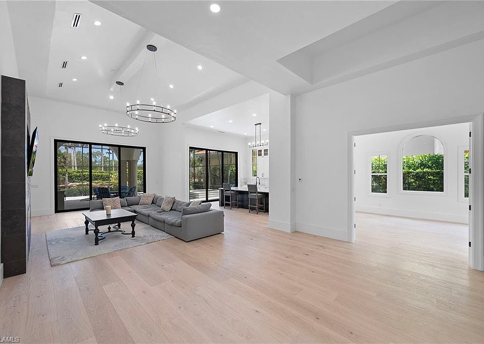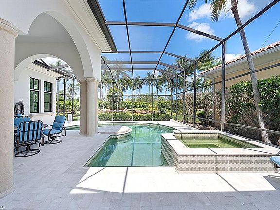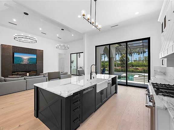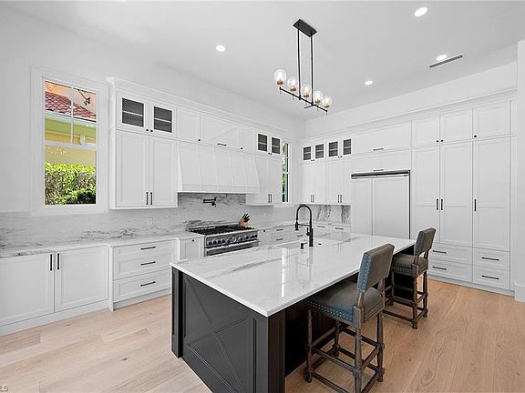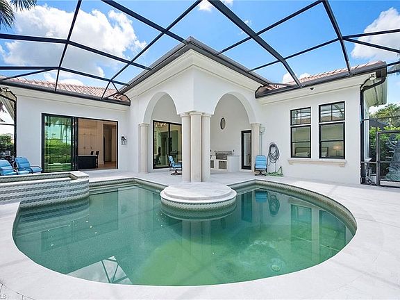 In the prestigious Tiburon community, this five-bedroom, 4.5-bath estate has been completely renovated for open-concept living, blending modern elegance with timeless sophistication. Thoughtfully curated finishes and designer details elevate every space, creating an inviting yet luxurious atmosphere. New White Oak hardwood floors flow seamlessly throughout, enhancing the open and airy feel. The custom-designed kitchen is a chef’s dream, featuring Décor cabinetry, luxury appliances and quartzite countertops, ideal for everyday living and entertaining. New Marvin impact windows and sliders not only enhance the home’s beauty but also provide superior insulation, allowing for a peaceful and quiet indoor retreat. Enter into spa-like serenity in the fully renovated primary bath, where a frameless glass walk-in shower with floor-to-ceiling natural stone, a sculptural free-standing tub, and a custom double vanity with high-end cabinetry create a tranquil retreat. Every detail is designed for beauty, function and relaxation. The outdoor living space is equally impressive, featuring a private heated pool and spa, a newly finished pool surround, and a fully equipped outdoor kitchen with a new grill, ideal for entertaining. A generous backyard retreat offers serene fountain views, providing a peaceful setting for morning coffee or evening gatherings. A private guest cabana ensures a comfortable, stylish space for family and friends. In one of Naples sought-after enclaves, this home offers access to world-class golf, resort-style amenities and the unparalleled service of The Ritz-Carlton. This is a rare opportunity to own a fully reimagined luxury home in the heart of Tiburon.