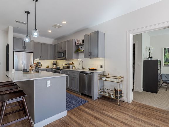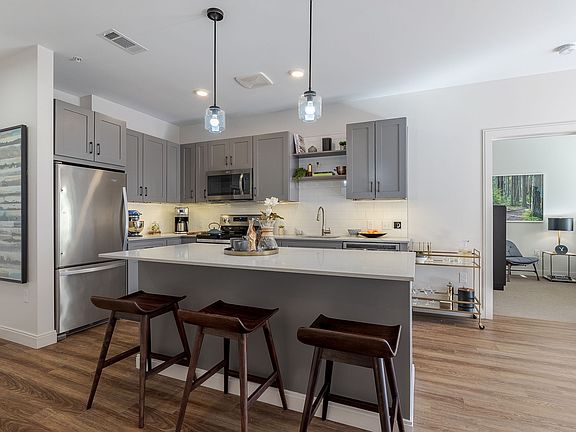 - Exterior features: Bicycle storage, Common Area Wifi, Concierge, Courtyard, Deposit alternatives available through Obligo, Dimmable Under Cabinet Lighting, Full Glass Showers, Game Room, High Ceilings, In-Residence Wifi, Mail Cafe With Coffee Station, Nearby Outdoor Nature Access, On-Site Management, Online Rent Payment, Oversized Windows, Pet Park, Quartz Countertops, Rooftop Deck, Solid Wood Shaker Cabinets, Sophisticated Symmons Fixtures, Stainless Steel Appliances, Studio, One-, Two- & Three-Bedroom Apartment Homes, TV Lounge, USB Outlets in Kitchen Island, Wood Closet Shelving and Storage Systems, Wood-Style Flooring in Living Areas