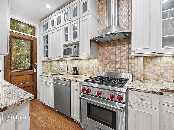 To the rear, you will find a bright updated kitchen where stainless steel appliances—including dishwasher and hooded range—abundant cabinet and counter space, and a neutral tile backsplash set the stage for endless culinary adventures. The adjacent formal dining room with calming garden views and brass chandelier is ideal for intimate dinner parties. A glass door off the kitchen leads down to the large private yard where you can plant an herb garden, host summer cookouts or get your daily dose of vitamin D. Currently divided into three storage rooms, the downstairs cellar with a separate front entrance and rear garden access can be reimagined to additional living space.