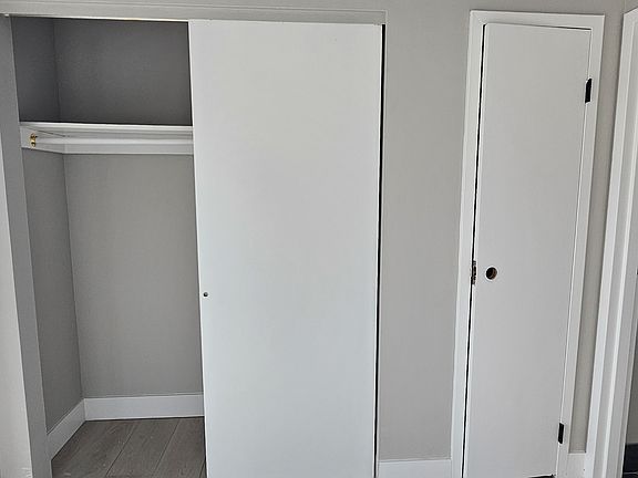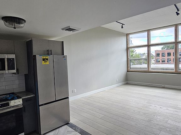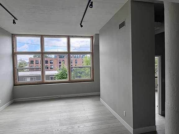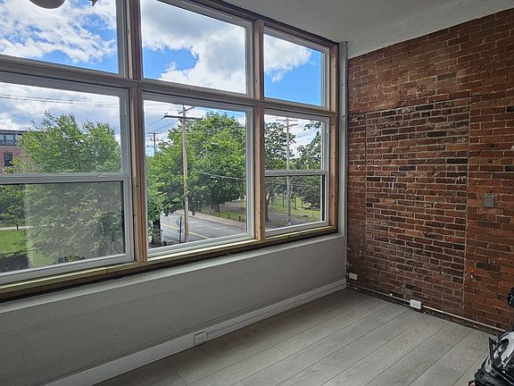 Exposed brick in bedroom, industrial sized windows, high ceilings, microwave, off street parking, shared laundry room and elevator in building.