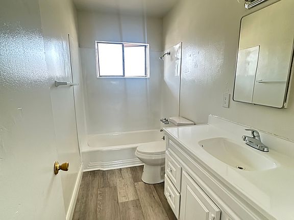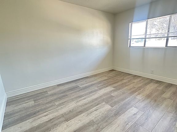 New blindsNew wood flooringStainless sink in kitchenCeiling fan in bedroom