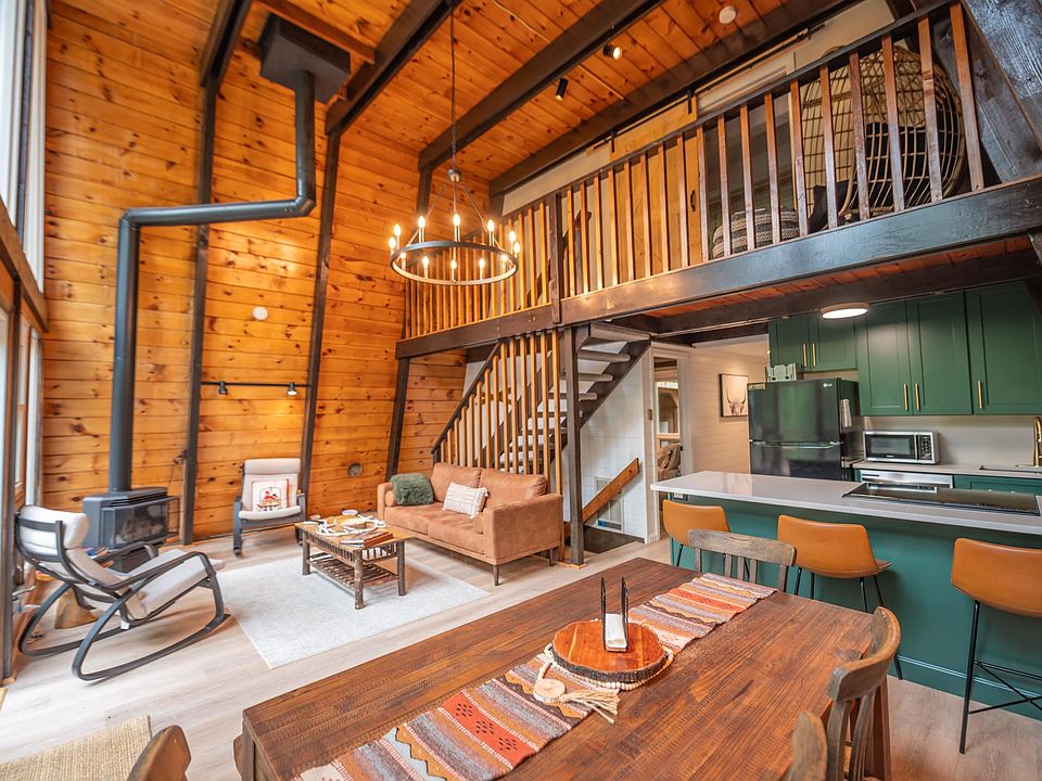 Upper level loftSecond media roomPrivate parcelLarge bedroomEfficient gas stoveLarge family roomNatural woodwork