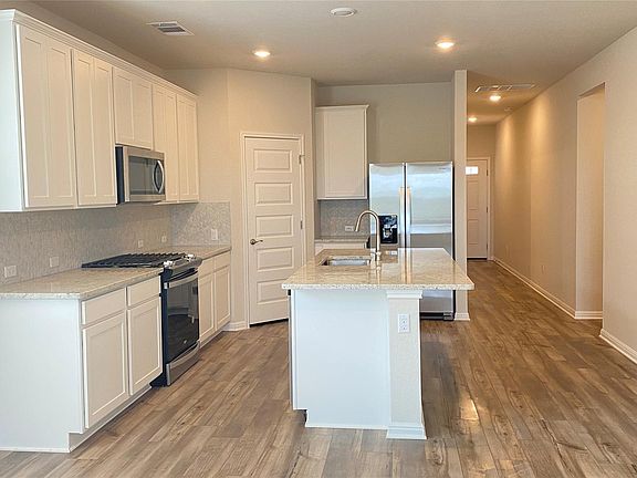 This is your beautiful home built in 2023 and offers 5 bedrooms, 3 baths, 2 bedrooms downstairs and an office/flex room upstairs, covered back patio, a fenced yard, and a view to green belt in the back yard. all stainless-steel appliances in the kitchen, coming with a washer, dryer, and refrigerator. Auto sprinkler system in the front and back yard. All nature color in the house. Cozy house you would like to have!
