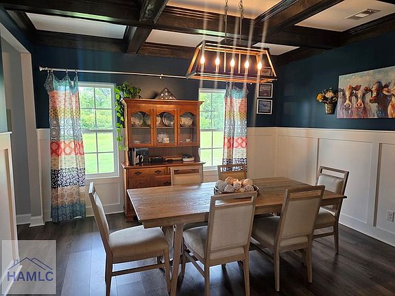 Country living on over 1 acre! This beautiful home features stainless steel appliances including built-in oven, microwave, electric cooktop, dishwasher, and island hood vent. Interior highlights include a stained wood coffered ceiling in the dining room, 5” baseboards, crown molding (downstairs), white cabinets with granite counter tops, white subway tile backsplash, LVP flooring on main level and upstairs hall, tile in upstairs baths, and carpeted bedrooms. The spacious master bath offers a full tile shower with glass door. Exterior features include vinyl siding, architectural shingles, front shutters, private well and septic, a chicken coop, and storage shed—all included. Enjoy peaceful surroundings with modern comforts. Easy to view—schedule your showing today! This home offers space, style, and serenity. Easy to view—schedule your showing today!