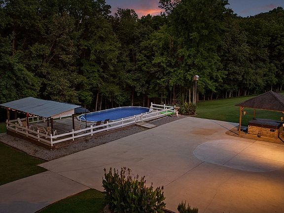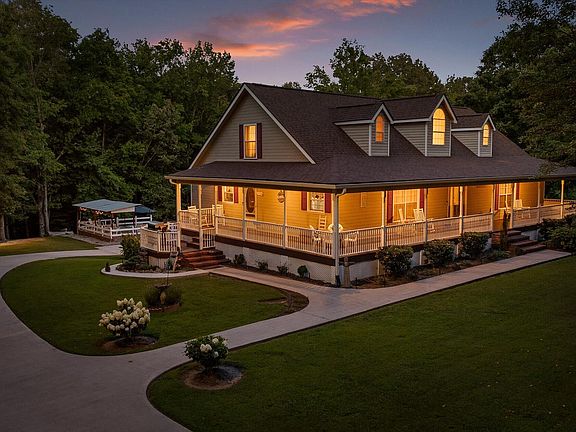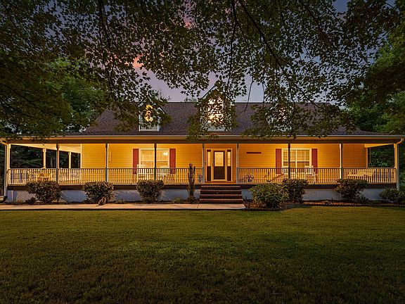 A slightly winding driveway through the woods leads to the charming ranch house, beautifully designed with dormer windows and a wrap-around porch that invites you to enjoy morning coffee, evening sunsets, and timeless Southern charm. The land itself is a true sanctuary, featuring walking trails, a lush garden, blueberry and blackberry bushes, fruit trees, a sparkling pool, a hot tub, a firepit with wood stands, a picnic area with handmade swing, a storage shed, and a chicken coop—perfect for your hobby farm or simply relaxing in nature.