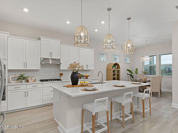 Waterfront Luxury in WaterSong at RiverTown. Step into this stunning 2023-built Pier Model, offering 1,914 sq. ft. of thoughtfully designed living space in WaterSong, Northeast Florida's premier 55+ gated community. With 2 bedrooms, a versatile den/flex room, and 2 baths on a premium 0.17-acre waterfront pond lot, this home blends modern elegance with relaxed living. Inside, you'll find wood plank tile flooring, crystal drop chandeliers, and a den with French doors that add charm and versatility. The gourmet kitchen is a showstopper, featuring white and gray quartz countertops, buffet counter with beverage fridge nook, an oversized dining island with coastal pendant lighting, stainless steel appliances, a built-in oven and microwave, gas cooktop with range hood, and chevron subway tile backsplash, perfect for entertaining or everyday luxury. The primary suite impresses with a tray ceiling, spa-like zero-entry shower, and oversized walk-in closet with luggage storage. Enjoy Florida living at its finest on the extended screened lanai with ceiling fan, overlooking the tranquil pond. Additional upgrades include a wrought iron fenced yard, tankless water heater, water softener, and extended garage for storage and convenience. WaterSong at RiverTown is designed for active adults, with exclusive amenities including resort-style and lap pools, pickleball and bocce ball courts, fitness centers, event lawns, a Biergarten, community events, and a full-time lifestyle director. Plus, you'll also enjoy all of RiverTown's amenitiesfrom the lazy river and kayak launch to riverfront pools, café, tennis, sports fields, and miles of nature trails. This home is more than a residence. It's a retreat where you can relax, socialize, and live your best Florida lifestyle.