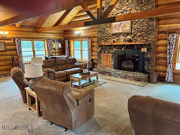 This Rocky Mountain Log Home has it all! Great value with this 2,788 sq ft, 4 BR, 2 BA creek front home. Situated right above what is one of the finest creek front lots in Seeley Lake, this 3.53 acres on 2 separate, buildable lots boasts nearly 550 feet of rambling and scenic Morrell Creek. This home is spacious and open with an unforgettable family room with vaulted log and pine ceilings warmed by a dramatic natural rock fireplace. Four separate decks allow for morning sun on your coffee and evening relaxation and entertaining sunset cocktails on the large, trex deck overlooking Morrell Creek. The main bedroom is one to remember with custom wood flooring, a cozy bedside fireplace and a patio opening to the relaxing sounds of the creek. The additional rooms are oversized and allow great space for a guest bedroom, home office and work out room. The detached 2 car garage has ample space for shop tools and your recreational equipment. The property is a wildlife watchers delight with frequent whitetail deer, birds, and other wildlife surprises. In addition to a recent installation of a new metal roof, the home has central heat, tankless hot water, and underground sprinklers. What’s more? This offering is mostly turn-key with furnishings included. Although a portion of the main home garage is situated on the adjacent creek front lot which is included in the purchase, the property would be perfect for construction of a separate guest or family member cottage or a income producing long term rental. The large kitchen allows for your personalized new cabinetry and appliance updates. The home is perfectly located in a private location, yet only a few blocks from local shopping, the 18 hole Double Arrow Golf Course, excellent dining options, lake access, cross country skiing and snowmobile trails.