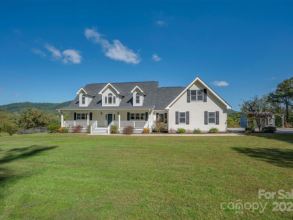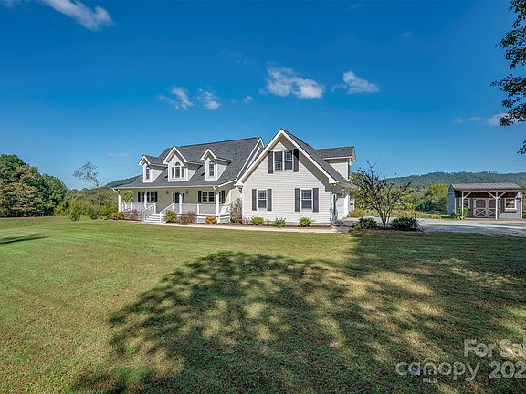 This spacious 3,529 sq ft home is centrally located between Hendersonville and Asheville, offering year-round mountain views from a private 4-acre lot. The home features an open floor plan with soaring ceilings, large windows, and skylights that fill the space with natural light and maximize the stunning views. The well-appointed kitchen includes stainless steel appliances, a breakfast bar, hickory cabinets, and a large walk-in pantry. The kitchen flows seamlessly into the dining area, which boasts a thermostatically controlled gas fireplace, and is open to the living area and rear deck—perfect for family gatherings and entertaining. Recent updates include new vinyl plank flooring and new carpeting in the bonus room. The primary suite offers a tranquil retreat with double walk in closets, an en-suite bathroom with jet tub and walk in shower. Additionally, there is a large main level bedroom and a third bedroom located upstairs. A huge bonus room above the garage, with separate entry stairs, provides an ideal spot for a game room or private living area. Additional features include an oversized two-car attached garage, a separate storage building, and a metal carport. City water and natural gas is also available, as per seller