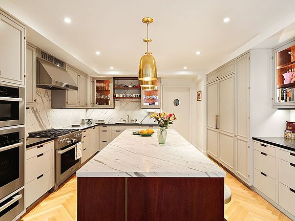 The quiet and spacious Primary Bedroom with lovely Southern light has 2 large walk in closets and an en-suite spa 5-fixture bathroom with slabs of Dolomiti white marble, hand-crafted mahogany vanities with Lefroy Brooks fixtures, radiant heated floors and separate water closet.The Second bedroom facing the tranquil garden, features en-suite bathroom with a deep soaking tub, Carrara marble walls and black Nero Manquina marble floors and satin nickel fixtures. The third bedroom offers East views and an en-suite bathroom with a large stall shower and hand cut Carrara marble walls and black Nero Manquina marble floors and satin nickel fixtures.