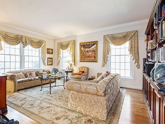 Standout features include: an entry porch; living room with built-in bookcase; formal dining room with decorative columns; eat-in kitchen with 2 sinks; 2 dishwashers, double wall ovens, quartz countertops and sliding glass doors to the rear deck; family room; master bedroom suite with walk-in closet; finished walk-out basement with recreation room, windowed storage room (or office), laundry room, powder room and sliding doors out to a private covered patio and level, grassy backyard; 2-zone HVAC; internal intercom system to all levels; 2-car driveway; 50-by-100-ft. lot.