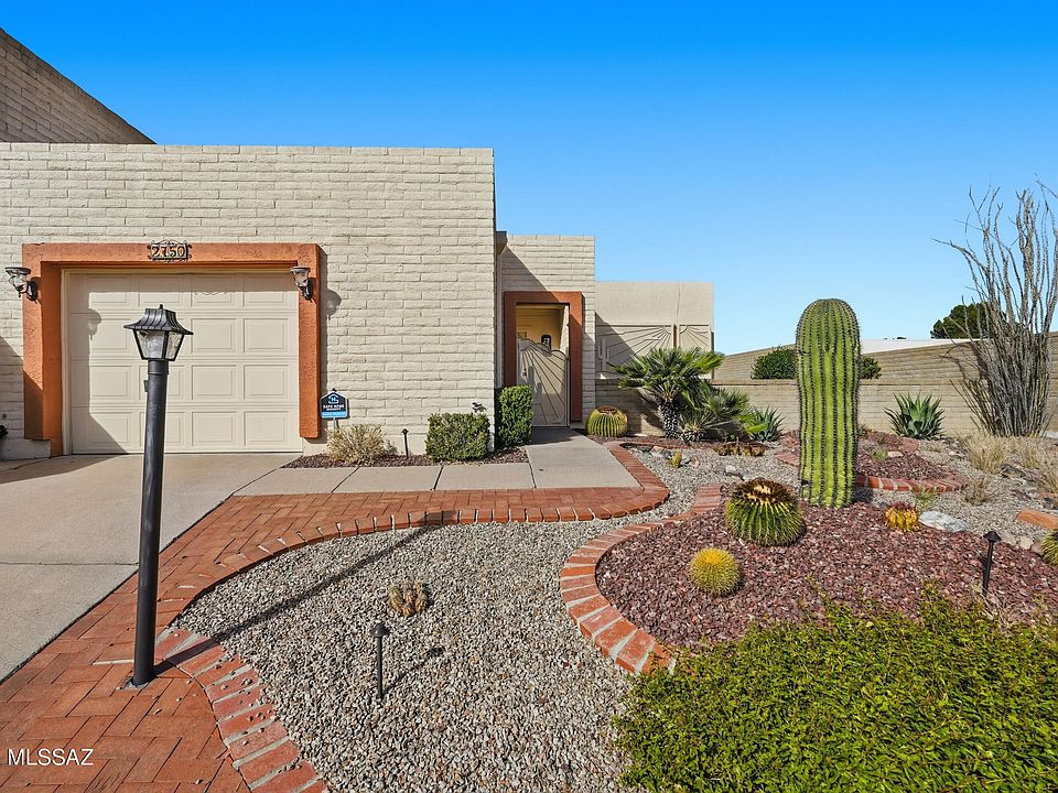 CHARMING Territorial Townhome in Green Valley Desert Hills 2 with an ELEVATED LOT giving WONDERFUL MOUNTAIN and GOLF COURSE VIEWS!!! BEAUTIFUL enclosed FLAGSTONE courtyard and COZY wrap around BRICK PAVER patio with RAISED planter beds and LOW CARE desert plantings. Inside you will find an UPDATED kitchen with GRANITE counter tops, maple wood cabinets, double sink, flat electric cook top, separate oven, stainless steel microwave and dishwasher and BUILT IN office nook with cabinets, GENEROUS pantry closet, laundry room with FRONT LOAD washer/dryer and STORAGE cabinets. OPEN living room and dining room concept. ENJOY the enclosed SUNNY AZ ROOM with FLOOR TO CEILING windows and equipped with heating/cooling as well as patio slider doors that open to the out door brick paver patio. Primary suite includes a walk in closet, updated bath with executive height vanity, cultured marble counter tops and walk in shower. ENCLOSED garage with electric opener, BUILT IN storage cabinets, separate STORAGE CLOSET with work bench and tool storage. NEWER HVAC system and WATER heater. Water softener. Ceiling fans and window coverings. DON'T MISS THIS ONE!!!