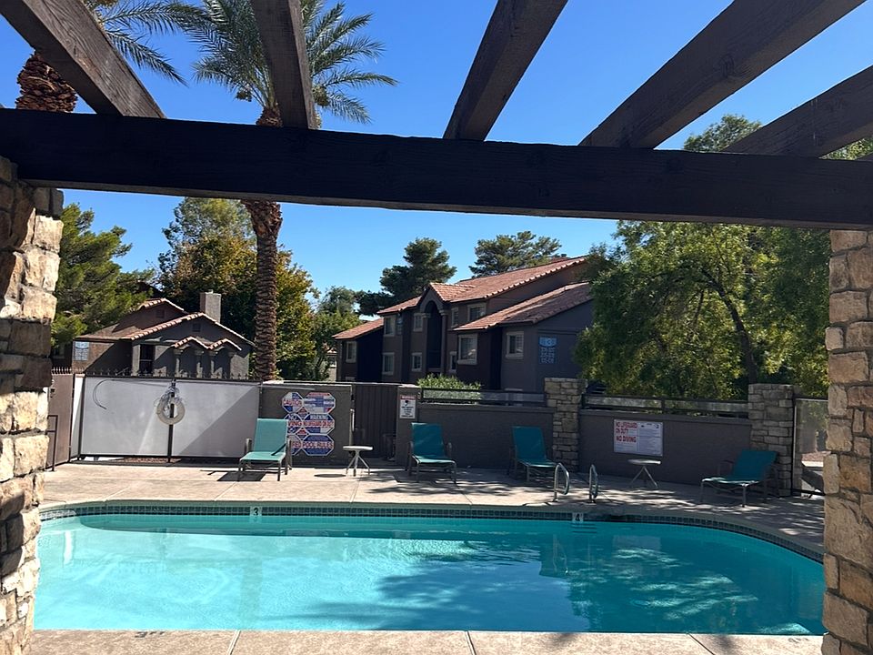 Relax in a quiet, well-maintained community with a pool, covered parking, and lush surroundings perfect for comfortable, low-maintenance living in a prime Las Vegas location.