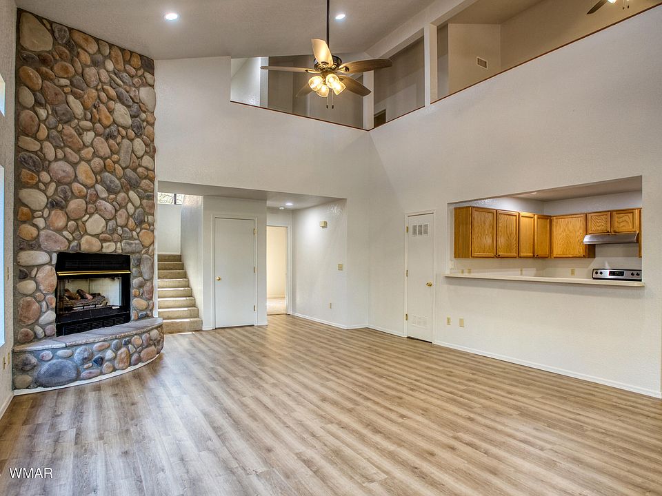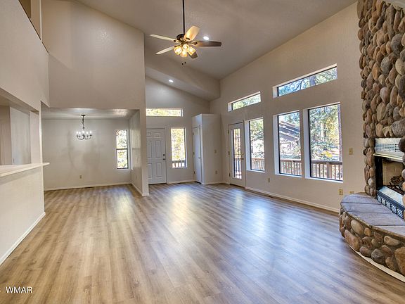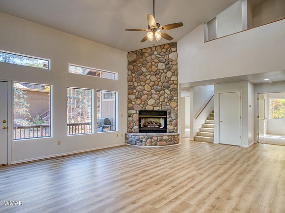 Spacious 3BD/3BA townhome has soaring ceilings, a full-height riverstone fireplace, and LOTS of windows & natural light. The primary bed and guest bed/bath are downstairs, while 3rd bed & bath are upstairs. The HUGE loft is full of potential for bunk beds, potential 4th bedroom, and has a bonus space perfect for a cozy reading nook! The bright interior has been freshly painted and updated with Luxury Vinyl Plank flooring, new carpet, new fixtures, and recessed lighting has been updated with LED's. Enjoy the outdoors on the large deck, or walk over to the Rec Center where you will find activities, fitness facilities, pool, tennis & more! This unit is nestled in the center of the complex off the main roads, and has a one car garage. A must see! Owner is licensed to sell Real Estate in AZ.