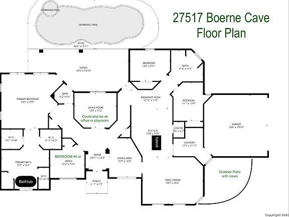 Welcome to 27517 Boerne Cave-a beautiful home in the sought-after Boerne community of Country Bend, where charm, space, and privacy await. Nestled on a 1.17-acre corner lot shaded by majestic oak trees, this 4-bedroom home offers peaceful Hill Country living in one of Boerne's most desirable neighborhoods. Inside, multiple living areas invite gathering and connection, while outside, a Keith Zars pool and hot tub create the perfect retreat for relaxation or entertaining. The half bath with outdoor access is ideal for poolside convenience, and the floor plan (included in photos) showcases flexible spaces, including a room that could serve as an office or playroom. Enjoy Hill Country views from the welcoming front porch and additional stone patio that captures the evening breeze. Conveniently located within top-rated Boerne ISD and just minutes from La Cantera, The Rim, and local dining, this home combines warmth, character, and function.