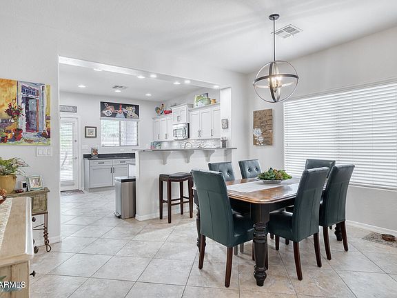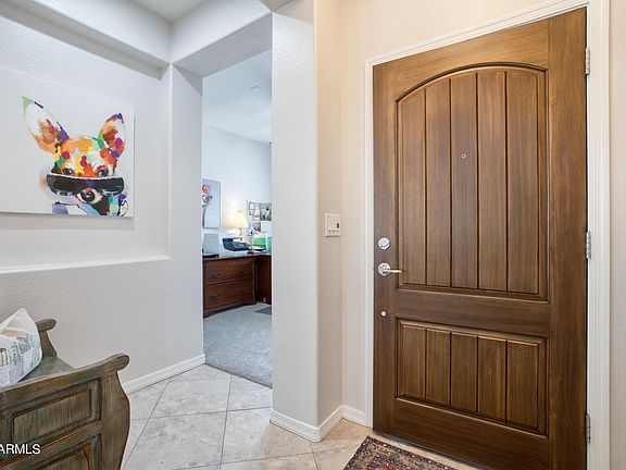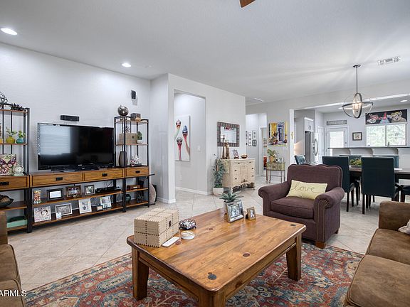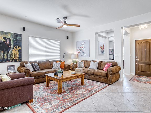 This gently lived in, updated home backs to green space w/a small play area at the far end. The open floor plan serves well for family & friends' gatherings. Neutral walls and floors play to any furnishings. Updated kitchen looks over great room. Primary suite has backyard access through French door & customized walk in closet. Bdrm 2 has small walk-in closet, bdrm 3 roomy sliding door closet. Den at front of house has nice-size walk-in closet. The 1 yr old 16 seer HVAC has 2-stage cooling & gas heat w/4 yrs left on maintenance agreement. All ceiling fans were replaced w/newer look. Complete new irrigation system installed. Utility sink was installed in garage. All new 10 yr lithium battery smoke detectors installed May 2024. Garage has epoxy flooring, utility sink, 4'x8' slat wall for storage, built-in cabinets, door to side yard and water softener. My Q app is programed to garage door opener for alerts when your garage door is opened and closed & works w/Amazon deliveries. The backyard is a low-maintenance sanctuary! A few succulents & flowering bushes w/artificial turf & pygmy palms create an oasis to enjoy. Add the trees behind that you don't have to take care of and mountain views along w/the firepit to enjoy on cooler nights & you'll be a happy camper. Fireside amenities are many! Gym, 3-story rock climbing wall, tennis courts, pools, spa & so much more! So many stores, restaurants & other amenities close by make this a desirable place to live.