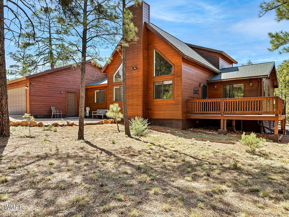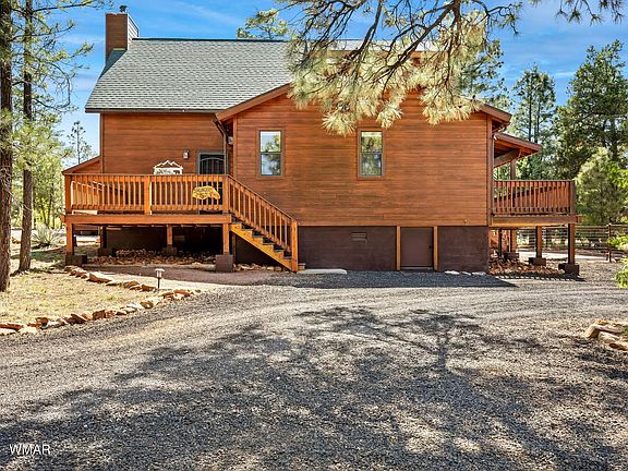 Nestled on 1.33 acres of serene land in Section 31, this cedar-sided cabin embodies rustic charm with modern comforts. Boasting a chalet-style design, the home features 3 bedrooms, 2 baths, and a cozy loft. Inside, a tongue-and-groove ceiling adds character while laminate wood flooring complements the warmth of a carpeted loft. The centerpiece is a gas fireplace adorned with floor-to-ceiling rock facia, perfect for chilly evenings. A lodgepole railing accents the interior, along with wood-stained doors and trim. The kitchen delights with stainless steel appliances, knotty alder cabinets, and a convenient island with a breakfast bar. Outside, Trex decking invites relaxation, overlooking the fenced backyard. Practical amenities include a 2-car attached garage with a 32' depth and 18' etc... door, ensuring ample space for vehicles and storage. With no HOA, this property offers freedom and flexibility, while a well share provides essential water access. Embrace the essence of mountain living in this inviting retreat. Call Today! Seller holds an inactive real estate license in the state of Arizona.