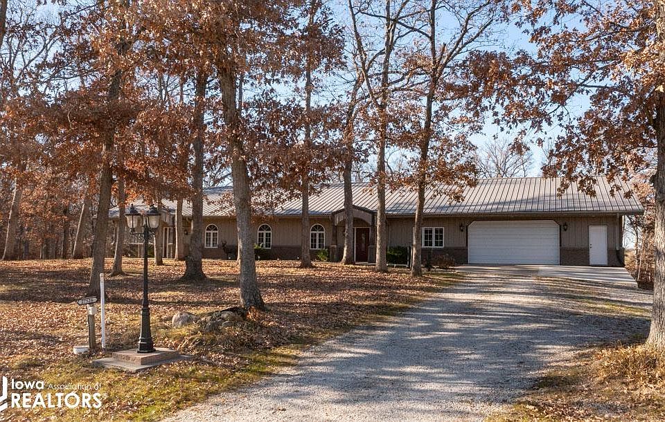 Within an hours drive of West Des Moines, you will find this custom built acreage with high quality amenities that features 4 bedrooms, 3 full bathrooms, 2 half baths, and 2 car attached garage all on one level. All appliances in both kitchen stay along with the washer and dryer. Master Bedroom features features private bath, jacuzzi tub, shower and walk in closet with abundant storage. This property also features a bedroom with en suite bathroom. One extra large bedroom could be used for a multipurpose room including quilting or other hobbies. Two fully functional kitchens makes cooking for a crowd an easy task. Entertaining at its best with custom made booths and tables, chairs, and bar stools to match. Marble countertop and island makes cleanup easy. This home has an abundance of custom made cabinets and closets. Theater room is set to be used with sound system and 8 reclining chairs. Wildlife views including deer and turkey are abundant out the back window. Enjoy relaxing around the stamped fire pit area in the serene country atmosphere. Extra detached garage has plenty of storage for yard equipment and extra vehicles.
