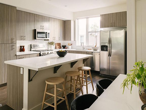 This sophisticated, modern townhouse in prime Silver Lake provides easy living with both security and proximity to some of the sought-after neighborhood's favorite spots. It's located in the well-maintained, gated Latitudes community on a hill that features expansive views in multiple directions. The reasonable HOA provides significant amenities - pool (with pool bathrooms and shower), spa, large communal lawn, and lovely landscaping throughout. The well-appointed unit - one of the quietest in the community - has architectural features like high ceilings, large windows for abundant natural light, and a thoughtful layout for everyday comfort. A landscaped front patio and private, attached two car garage with storage space welcome one to an oversized foyer, which can double as a bonus workspace. Upstairs, the main level provides soaring ceilings and an open plan for cooking, dining, and lounging. The newer kitchen is also adjacent to a guest bathroom. On the upper level are two ensuite bedrooms with large windows. The primary suite also includes a dual vanity, private toilet room, and walk-in closet. In-unit laundry is conveniently located between the two bedrooms. The townhome is mere blocks from award-winning schools like PLAY preschool and Ivanhoe Elementary, neighborhood grocery stores including Whole Foods, Trader Joe's, and Gelsons, and of course, the chic restaurants and coffee shops like Blairs, Makisupa, Broome St. General, and Edendale that make Silver Lake such a celebrated community.