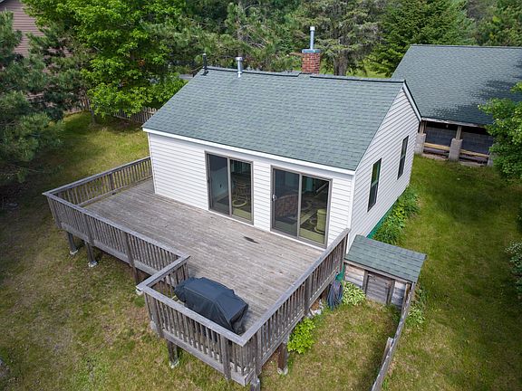 Wake up every day to the tranquil and crystal-clear waters of Devils Lake with this idyllic adorable one-bedroom, one-bathroom Cottage. The property is highlighted by its signature charm, towering pines, a steel-sided cottage with an expansive deck that provides panoramic views of the breathtaking Devils Lake – an endless vista of natural splendor worth celebrating every day. Step into your new cabin life with a lively and inviting trendy open-concept kitchen, intricately adorned with cherry color cabinets. The dwelling’s trendy layout brings in the sun to enjoy several relaxation areas, all blended with its ample outdoor space. Stroll to the screen door style garage for an evening card party. More than just a property, it's your personal retreat with 100 ft of sandy pebbly rocky shoreline exclusively for your enjoyment; accented with boat lift, dock, raft & boathouse shed.