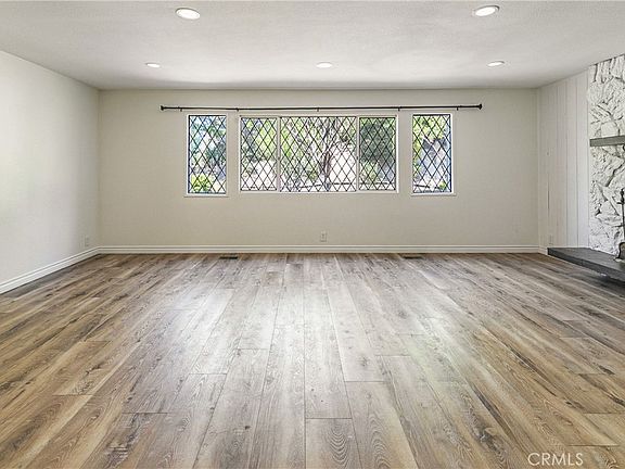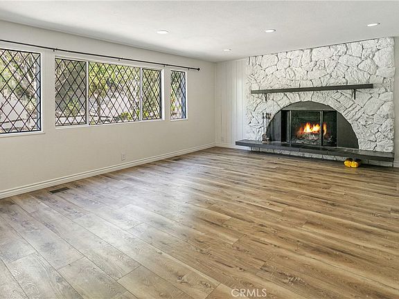 Step inside to discover warm wood floors, recessed lighting, and abundant natural light throughout. The inviting living room centers around a striking stone fireplace, perfect for relaxing with family and friends. The open flow leads seamlessly into the dining area and a beautifully updated chef’s kitchen with quartz countertops, modern appliances, and a stylish island with breakfast bar and microwave drawer.