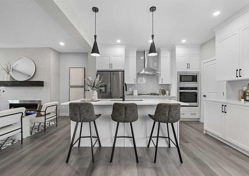 Welcome to this stunning new build by Genesis Builders Group in Bayside, which is ready for immediate possession and is sure to be a home you will love to call home. With its charming curb appeal and stone accents, this thoughtfully designed home seamlessly blends contemporary comfort with everyday functionality. Step inside to a bright, open-concept main floor featuring luxury vinyl plank flooring that spans the entire area, 9-foot ceilings, and a bright and airy front living room with a striking floor-to-ceiling tiled fireplace. The chef-inspired kitchen pairs crisp white cabinetry with quartz counters, a gas cooktop, a built-in wall oven and microwave, and a large island that's perfect for gathering. You'll love the walk-in pantry, complete with its own window, and the dining area, featuring built-in cabinetry and direct access to the rear deck. A main floor bedroom (or home office) and full 4-piece bath offer valuable flexibility, while the custom mudroom with built-in storage helps keep everything organized. Upstairs, a spacious bonus room separates the serene primary suite from two additional bedrooms. The primary offers a tray ceiling, a large walk-in closet, and a spa-like ensuite with dual sinks, an oversized tiled shower, and a soaker tub. The laundry room is also located upstairs and includes a sink and cabinetry for added convenience. Complementing this floor is an additional full bathroom. The basement is unfinished and ready for your design ideas, as well as the option to build a triple garage with a carriage suite (a Suite would be subject to approvals and permitting by the municipality), if you were so inclined, on the already poured concrete pad. Set in the heart of Bayside, steps from pathways, canals, parks, and Nose Creek Elementary this home is sure to please. *Area size calculated using RMS guidelines from builder-provided blueprints. *Genesis is offering the option to build a triple garage on this property for an additional $50,000.