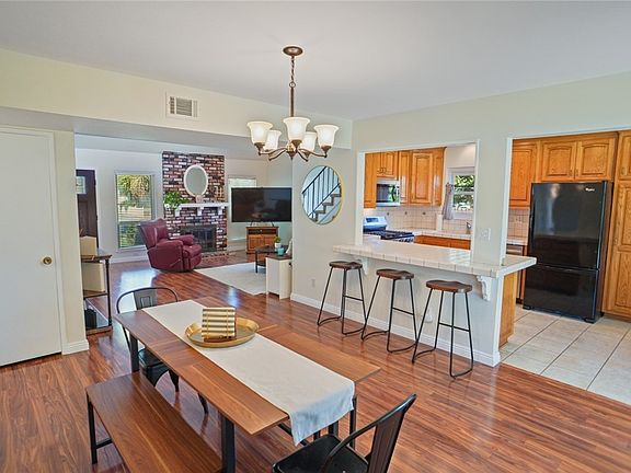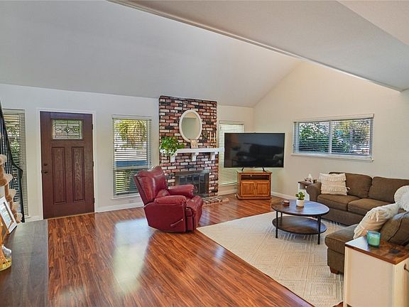 Inside, a spacious living room with a cozy fireplace flows into a dining area, creating an ideal space for gatherings. The kitchen features warm oak cabinetry, a convenient breakfast bar, and brand-new stainless steel stove and microwave. A desirable floor plan includes one bedroom downstairs, perfect for guests or multi-generational living, and additional bedrooms upstairs for privacy.