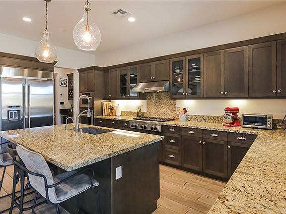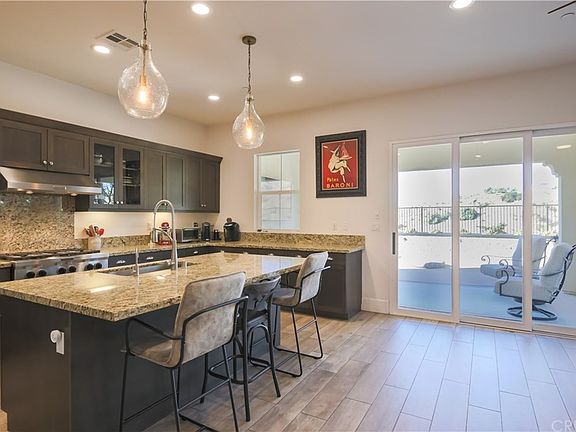 Pride of ownership! This gorgeous, Urban Modern Rustic home is located in the gated, Heights community of Five Knolls. You will be drawn in by the stunning porcelain wood-look tile flooring and details in every corner. Enjoy the benefits of owned solar and the reverse osmosis system. Chef's kitchen boasts a butler's Pantry, granite countertops, center island with bar seating, stainless Jennair appliances, walk-in pantry, single-basin sink, and ample cabinet space. Adjacent is the great room and formal dining. Slider doors lead to the California Room, offering flex indoor/outdoor living space. Downstairs bedroom with en suite bathroom can be guest room or office. Upstairs Master features a spacious deck with mesmerizing views of the Santa Clarita Valley. Enjoy the walk-in closet with Elfa custom closet shelving and modern chic chandelier. Fall in love with the en suite master bathroom and oversized, tiled shower with bench seating. Italian marble surrounds the soaking tub and dual sinks. Upstairs laundry, 3 additional bedrooms upstairs, loft with private balcony, high ceilings, stately ceiling fans throughout, and so much more! Some great exterior features include: Low-maintenance backyard with synthetic grass and drought resistant landscaping, firepit area, perfect for entertaining, large side yard, dry riverbed with natural stone, and ATTRACTIVE curb appeal. Convenient HOA amenities including controlled access, clubhouse, pool and spa! Welcome HOME!