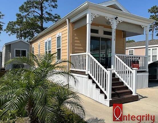 Discover this adorable and immaculate 1-bedroom, 1-bath every popular "tiny home" nestled in the sought-after Mill Creek community in Kissimmee, FL. Located just 10 miles from Disney, Orlando's top attractions, and Orlando International Airport, this all-age community is packed with fantastic amenities, including a swimming pool, mini-golf, a children's playground, planned activities, and more! Plus, it's just a short walking distance to all the amenities for ultimate convenience. Step inside to find a bright, open floor plan with modern finishes. The home comes TURNKEY fully furnished, featuring a stainless-steel refrigerator and well-maintained appliances. The spacious kitchen offers built-in storage, a cozy dining area, and a convenient coffee bar. The full bathroom includes a bathtub for added comfort, and the washer and dryer are conveniently located near the master bedroom. A NEST thermostat ensures energy-efficient climate control year-round. Enjoy your evenings on the charming front porch, perfect for relaxing and greeting friendly neighbors. With a proven track record as a successful weekly rental, this property is ideal for year-round living, snowbirds, or as an income-generating investment. All listing information is deemed reliable but not guaranteed and should be independently verified through personal inspection by appropriate professionals. Integrity Mobile Home Sales cannot guarantee or warrant the accuracy of this information, measurements, or condition of any property. Measurements are approximate. Lot rent is subject to change.