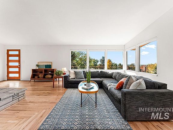 This updated mid-century home honors its heritage while embracing the ease of modern living. Elevated above its neighbors and surrounded by mature landscaping, the home feels like a modern treehouse overlooking the city. Remodeled kitchen and baths create a fresh aesthetic, while original wood and stone accents add warmth and authenticity. A cantilevered deck wraps around the home, inviting you to take in sweeping views of city, greenery and sky. Clean lines, natural materials, and a modern wire railing echo the home’s mid-century roots—an ethos of simplicity, function, and connection to nature. Inside, refinished hardwood floors and crisp white paint create bright, open living. The remodeled kitchen features warm wood cabinetry, quartz counters, stainless steel appliances, and stacked tile—a nod to timeless design. The living area centers around a stacked stone fireplace framed by corner windows. Two main-level bedrooms enjoy a beautifully updated bath where the original turquoise tub and toilet have been preserved, now paired with new terrazzo-style tile, sleek vanity, and mid-mod flair. The walk-out lower level provides bonus room, full bath, and 2 additional bedrooms. Outside, the tiered yard unfolds like a secret garden with stone paths, native boulders, groves of mature trees, and tucked-away spaces for gathering, gardening, or peaceful retreat.
