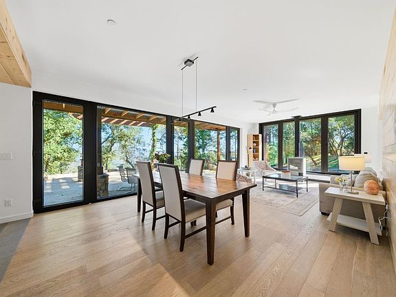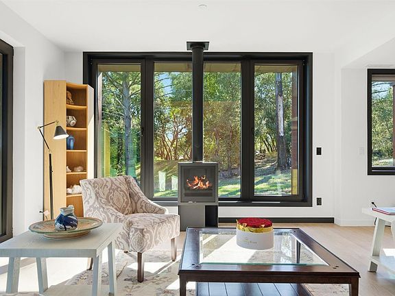 Nestled on nearly 6 acres at the end of a quiet cul-de-sac, this exceptional modern home on one level offers a rare blend of design, comfort, and sustainabilityjust a short drive to Bennett Valley shops, downtown Santa Rosa amenities, top-rated schools, and world-class Sonoma wineries. Built in 2021, the 3BD/3BA residence showcases clean architectural lines, weathering steel (Cor-Ten) exterior, western white pine accents, white oak hardwood flooring, and Daltile tiles that add subtle sophistication throughout. Expansive walls of glass frame stunning views of rolling hills, mountains, and mature trees. The open-concept great room with a sleek gas fireplace flows into a designer kitchen featuring quartz countertops, premium finishes, a double oven, and outdoor dining under a custom pergola. Custom blinds in the bedrooms offer privacy and comfort, while a separate study provides the ideal space for work or creativity. Solar power, a standby generator, native landscaping, and a shipping container for storage complete this peaceful, stylish retreat where modern living meets sustainability in the heart of Bennett Valley.
