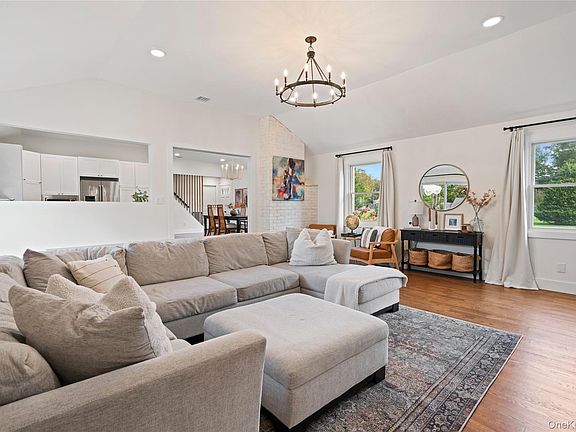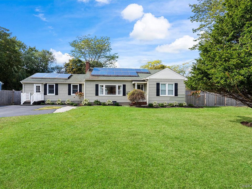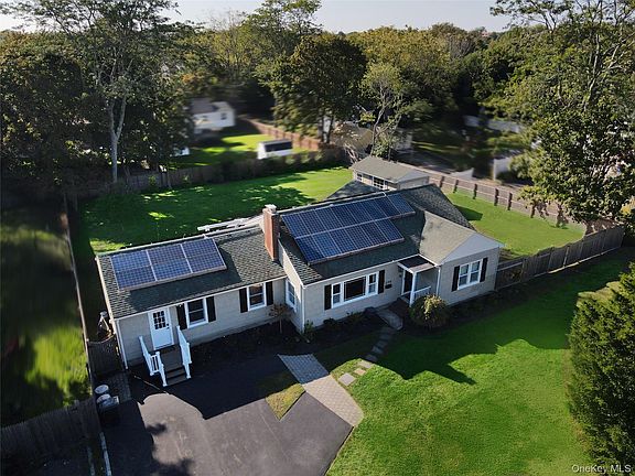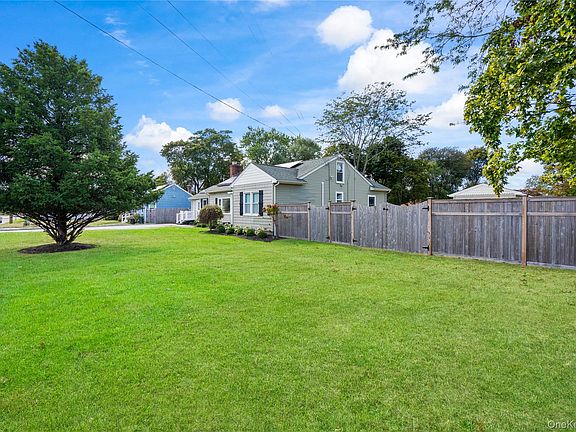 Beautifully updated and expanded ranch located south of Montauk Highway in Patchogue Village. This sun-drenched custom 3 bedroom home is currently configured as an oversized 2-bedroom, 2-bath with a spacious bonus loft that could be office or additional bedroom with permits. Architectural plans for a 3-bedroom conversion are already pre-approved by the village. Designed with both style and function in mind, the home features a large living room with vaulted ceilings, recessed lighting, and sliders to private deck and oversized yard. Welcome to your dream kitchen, with modern flare designed for the avid cook and entertainer. Featuring a sleek wood island and walls of cabinets, this space offers ample storage and prep areas. Stainless steel appliances bring a professional touch to your culinary adventures. The kitchen flows effortlessly into a large dining room with a cozy fireplace, creating the perfect setting for hosting gatherings. Enjoy cooking and entertaining in style in this beautiful and functional space. Warm and cozy primary bedroom features a fully fitted custom walk in closet. Gorgeous brand-new bathroom, thoughtfully designed with modern elegance. The sleek tile flooring adds a contemporary touch, enhancing the room's chic aesthetic. A spacious double vanity offers ample counter space and storage, perfect for morning routines or evening unwinding. refinished original hardwood floors throughout. Unfinished basement is great for even more storage as well as unfinished attic space and 1 car detached garage. All major appliances and the HVAC system are less than 3 years old. Gorgeous manicured double lot just shy of a half acre with maturing privacy trees and fully fenced, and a large deck for entertaining . Leased solar provides a discounted electric bill every month with option to buy out at end of term. This home is a move-in-ready must-see!