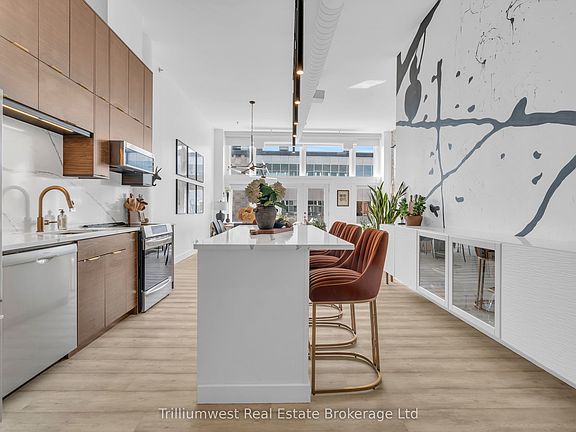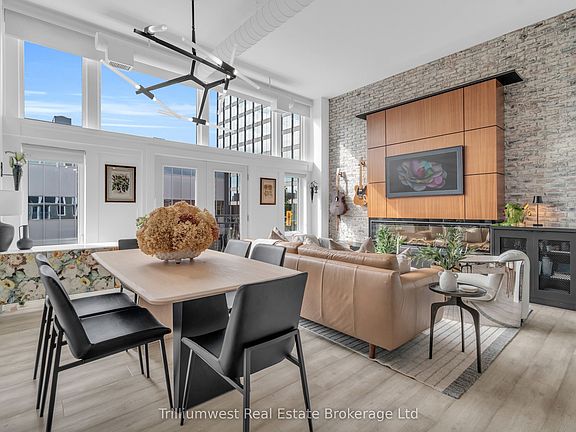 One-of-a-Kind Loft in the Heart of Downtown Kitchener. Welcome to Unit 205 at The Lofts at 276, a stunning, modern, 1-bedroom, 2-bathroom suite that seamlessly blends industrial charm with luxurious finishes. This exceptional, one-of-a-kind space, offers soaring 12-foot ceilings, floor-to-ceiling windows, and garden doors that flood the open-concept living and dining area with natural light. Every detail has been thoughtfully curated, from the wide plank vinyl flooring to the custom design elements throughout. The gourmet kitchen is a chefs dream, featuring rich dark wood cabinetry, veined quartz countertops and backsplash, an oversized island with breakfast bar, custom wine rack, statement lighting and an eye-catching feature wall with built-in buffet. The expansive living area is perfect for both entertaining and relaxing, anchored by a custom fireplace surround with integrated dry bar, wine fridge, and complemented by a warm brick accent wall that adds character and texture. Elegant garden doors open to a Juliette balcony, adding a touch of European charm. The dining space comfortably accommodates family gatherings, offering the perfect setting for special occasions.The main bathroom offers a stylish vanity with a stone vessel sink and a tub with textured tile surround. Additional features include in-suite laundry, underground parking, and an oversized storage locker located just steps from your vehicle. Retreat to the primary suite through double doors to find a wood accent wall, sliding closet barn doors, a custom closet organizer, and a private ensuite. The spa-inspired bathroom includes a walk-in shower with striking black-framed glass doors, wood-look tile, and a generous niche with accent details. Set in a beautifully converted loft building with modern lobby, this home places you in the heart of vibrant Downtown Kitchener just steps from cafés, restaurants, transit, schools, entertainment, and Victoria Park. Urban luxury and everyday convenience await.