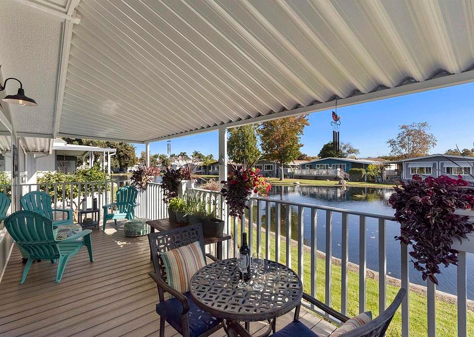Recently remodeled located on fabulous lake view lot! You can exit the great room area thry 12 foot sliding door to a huge deck that gives you view of the lake and watch the sun come up as well as the multiple ducks, turtles. This senior park (55+) has 8 lakes, acres of green belts filled with emerald green lawn, trees and flowers. This is a very unique location about 4 miles from sandy beaches, commuter trains, Oceanside pier. This property looks and feels like a stick built home that costs thousands of dollars more yet there is RENT CONTROL that keeps your monthly overhead very comfortable. The remodel is extensive and includes most of the home including a tankless water heater outside (see complete list of upgrades when you visit)! Park tennis/racketball court, year round heated pool, indoor spa, huge very classy club house with library, pool tables, card rooms where there are banquets and a stage for live music and a host of other very fun activites! You are close to grocery stores, medical services, Walmart. Lowes, Home Depot, exellent restaurantrs with a huge variety food! There is also a huge over size shed (12x10x10 for lots of storage. Come take a look at this unit that will make you feel like you are living in a secluded oasis!