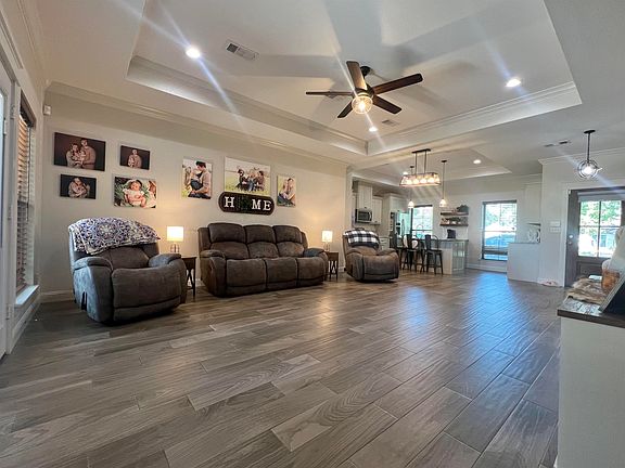Shiplap wall for tvFenced yardHigh ceilingsExtended patioSplit bedroom planRecessed lightingCrown moulding