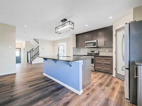 Not a condo property and no condo fees! Own your land with this updated 2 storey walkout home in Westmere under $500K! Modern open plan with spacious kitchen & many bright windows. Unobstructed views over the prairies behind and complete privacy. Stainless steel appliances, granite countertops & central island, with ample cabinet space & corner pantry. Upgraded durable vinyl plank flooring throughout the main level. 3 generous bedrooms up including oversized primary bedroom with 2 full bathrooms & great storage. Front bonus room rarely available in a duplex or townhome style layout! Soaring vaulted ceilings & ample room for a media/family room. Convenient second floor laundry. Undeveloped walkout basement with separate entrance leading to private, well sized rear yard. All the rooms, size, & amenities of a large more expensive home in an affordable turnkey package! Fully insulated attached garage with additional parking pad out front. Enjoy the rich amenities of Westmere including a winding network nature focused pathways and only 1 block walking distance to Chestermere Lake! One of the closest locations to all the amenities, shops, restaurants, & schools of Chestermere with a quick escape on the Trans-Canada to Calgary. Immense value in Chestermere!