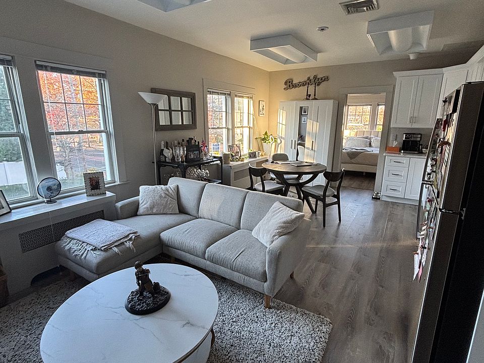 Bright 2 bed/1 bath apartment on beautiful Sound Beach Avenue in Old Greenwich. Renovated kitchen with stainless range, dishwasher and fridge. New granite countertops with modern backsplash. Washer and Dryer in the unit. Central A/C. Spacious closets in both bedrooms. Reserved parking spot in the back parking lot is included. Front entrance on Sound Beach Ave and rear entrance to private parking lot, so very convenient for daily living. Pets will be considered. Walk or bike ride to Todd's Point Beach. Shops and restaurants just steps away. Train station is .2 miles away (4 min walk). Districted to the highly coveted Greenwich school system. This charming opportunity in the heart of one of the most desired neighborhoods in Fairfield County won't last long! Please call or text Eve for more info.