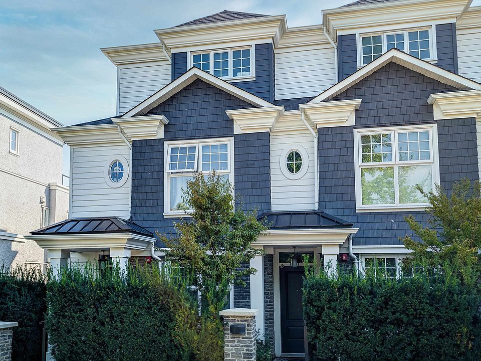 Elegant 3 Bed + Office, 2.5 Bath Corner Townhome featuring open living/dining with high ceilings, A/C, wood floors, and a chef’s kitchen with Liebherr & Bosch appliances. Enjoy a sunny south-facing patio, two bedrooms with ensuites, and a top-floor primary with spa ensuite, WIC, balcony & panoramic views. Lower level offers a large office, full laundry, and direct access to 2 parking with EV charger. Steps to Winona Park, Churchill catchment, shops & transit on Marine/Cambie. Open house: Oct 26 Sunday from 12pm to 1:30pm