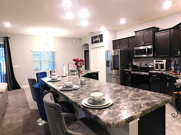 Welcome to Juliana Village, a gated Highland Homes community with private ambiance and beautiful, open conservation areas. This 2021 built home features 5 bedrooms, 3 bathrooms, a den/office, a wonderfully open floor plan in main living areas and luxurious features throughout. Set on a beautifully landscaped corner lot with Florida-friendly plantings, and water view from the large front porch, this property boasts impressive curb appeal. A grand double-door entry welcomes you into a light-filled interior with high ceilings, and a spacious, 3-way split-bedroom layout perfect for both everyday living and entertaining. The back bedroom with a private bath and separate entrance to and from the exterior could easily serve as in-law or multi-generational suite. The formal dining area flows seamlessly into the large great room, creating an open and inviting atmosphere. The well-appointed kitchen features, stainless steel appliances, a tasteful backsplash, ample cabinetry, a pantry, and a expansive breakfast bar for casual meals and entertainment. Each bedroom offers generous space, while the primary suite stands out with its massive walk-in closet and private, ensuite bathroom complete with a hydro-spa tub, walk-in shower, and dual sink vanity. At the back of the home is an enclosed and screened-in patio for year-round enjoyment. Auburndale provides small-town living near Orlando and Tampa. The home is centrally located in the Lakes District, surrounded by six lakes, parks, shops, restaurants, trails, and natural areas—all within walking or biking distance. Outdoor enthusiasts will appreciate access to six boatable lakes in the area, offering opportunities for kayaking, fishing, and enjoying the water. Schedule a private tour today.