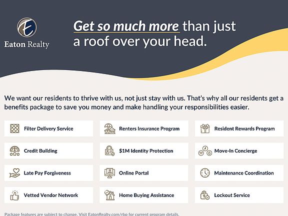An additional $59/mo. Resident Benefits Package is required and includes a host of time and money-saving perks, including monthly air filter delivery, concierge utility setup, on-time rent rewards, $1M identity fraud protection, credit building, online maintenance and rent payment portal, one lockout service, and one late-rent pass. Renters Liability Insurance is required. Learn more about our Resident Benefits Package.