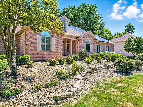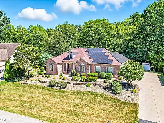 Tranquility awaits at this sprawling expansive ranch, breathtaking private views of ravine run/creek. First floor hosts magnificent great room, vaulted ceilings, cozy fireplace, custom built-ins, & wet bar. Walls of glass frame the serene landscape & open onto an expansive multi-level deck. Your private outdoor oasis complete with hot tub (new cover & circulation pump) new gazebo (2024), & updated deck lighting perfect for enjoying tranquil evenings. Kitchen w/ granite island, ample cabinetry, full suite of appliances that remain for new owner. 1st floor laundry, laundry chute to 2nd lower level laundry. Sun-drenched 4 seasons room offers a flexible space for morning coffee or a quiet reading nook. Retreat to the secluded primary suite, thoughtfully placed in its own private wing w en suite step in shower, large closet. Rounding out the 1st floor are 2nd primary en suite w step in shower, 3rd bed & bath, designated office w/ built ins & desk off of the front door. Lower level dramatically expands living space, in-law or guest suite w private access from garage or off 1st floor front door. This exceptional area includes a large family room, fireplace, counter w/ sink, 2 additional flexible rooms ideal for bedrooms or office, & a full bath. Expansive utility rooms & bonus workshop cater to every hobby & storage need w additional storage in walk up attic. Forward-thinking features, including solar panels & an EV charger for sustainable living. Updates: heated garage (2022), landscape lighting (2025), leveled driveway warranted to 2029, a 5-camera security system, generator hookup w/ transfer switch, programmable recirculation pump for instant hot water, radon mitigation system. Roof 2018, Shed 2022, lower level washer/dryer 2019. Expansive home w/ opportunity for 5+ bedrooms. One of a kind ranch awaiting your vision for perfection. Solar panels: 3 inverters w transferrable warranty, OH Edison for net metering & resale electric offer budget friendly electric needs.
