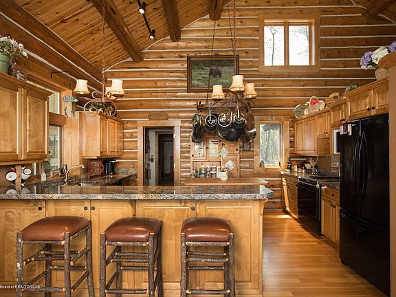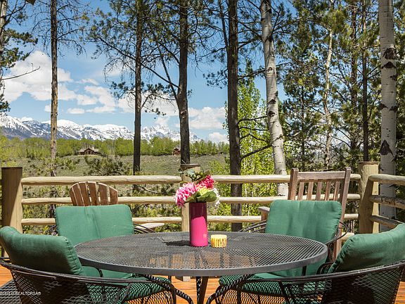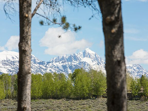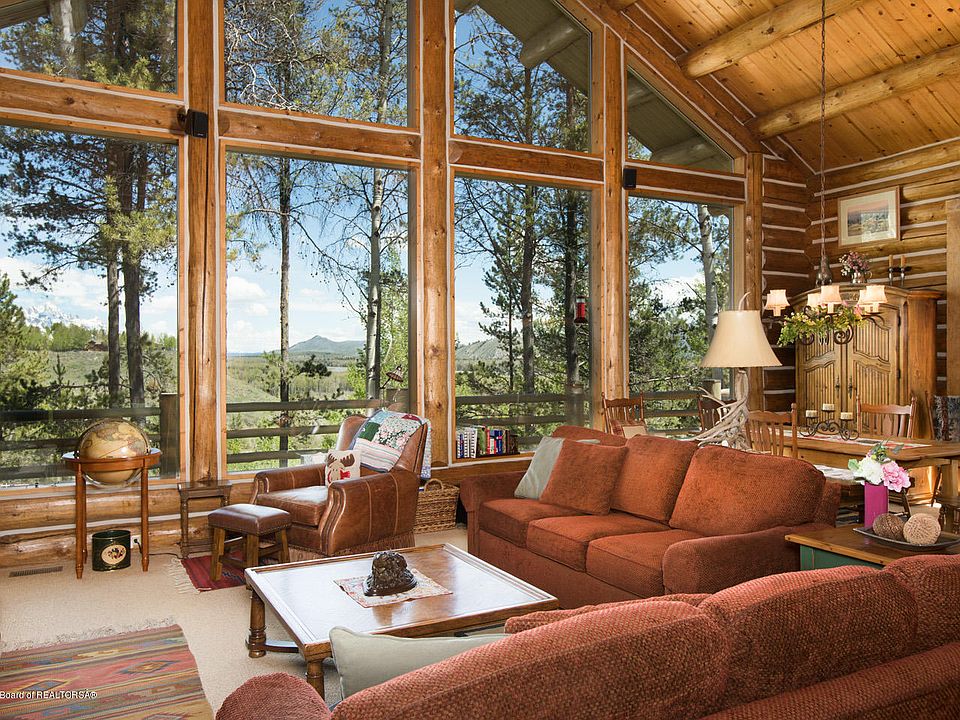 Stunning Grand Teton and Snake River views from this hand crafted, impeccably maintained, 3 bed/2.5 bath log home in Rivermeadows. Situated on .64 private acres, adjacent to 15 acres of open space, enjoy abundant wildlife sightings, mature landscaping and all of the peaceful sights and sounds that harmoniously blend with the home. The large great room features dead on Grand Teton views enjoyed either next to the wood burning fireplace or out the door onto the huge view deck. The living room opens to a spacious kitchen with granite counters, custom cabinets and bar seating. All of the bedrooms have walk out access to decks/porches. The 550sf library adjacent the kitchen, features a wood burning stove and walk out covered porch. All first class finish and trim work, with plenty of storage.
