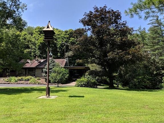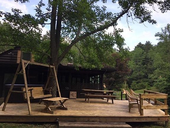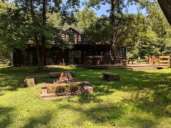 Hand crafted lodge type home, completely secluded, spacious great room & sun room. Heated slate floors in the great room. Massive gas fireplace stained glass windows. Large stocked pond, 3 miles of maintained trails. Property has free gas. Nice 2- bedroom guest cottage overlooking pond. Has heat pump. Hot tubs for both houses. Water is from a spring fed pond with a filtration system.