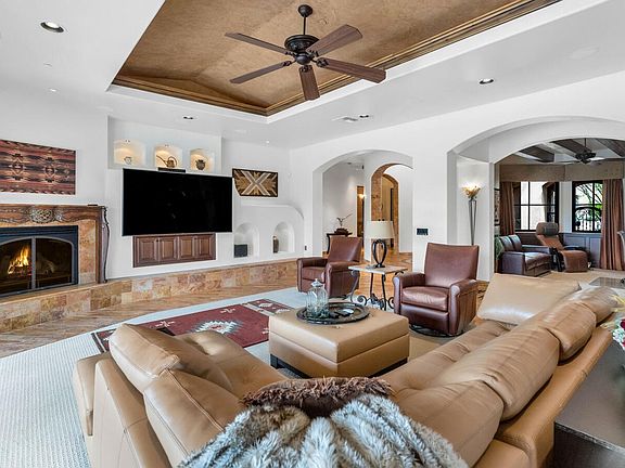 Throughout the home, masterful design elements captivate the senses: graceful arched niches, majestic dome ceilings, plank and Versailles pattern travertine floors, commanding cantera stone columns, artful designer paint, rustic wood-beamed ceilings, and bespoke custom wood doors. The palatial master retreat, a sanctuary of serenity, beckons with a tranquil sitting area, a lavish walk-in shower boasting multiple heads and settings, a mesmerizing negative-edge soaking tub with a ceiling-fill spout, exquisite designer cabinetry, dual sinks, two refrigerator drawers, and the cozy embrace of dual fireplaces.